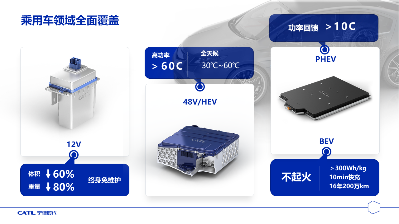 在乘用車領(lǐng)域,我們開(kāi)發(fā)了12V鋰電池輔助電源,和傳統(tǒng)的鉛酸電池相比重量減少80%、體積減少60%,而且可以終身免維護(hù)。我們開(kāi)發(fā)的48V和HEV用電池包,可以實(shí)現(xiàn)60C的高倍率放電。開(kāi)發(fā)的PHEV電池包,可以實(shí)現(xiàn)10C以上倍率的制動(dòng)能量回收。正在開(kāi)發(fā)的BEV電池包,可以實(shí)現(xiàn)超過(guò)1000km續(xù)航、10分鐘的快速充電、16年200萬(wàn)公里的使用壽命,基本解決消費(fèi)者里程焦慮、充電焦慮和壽命焦慮。